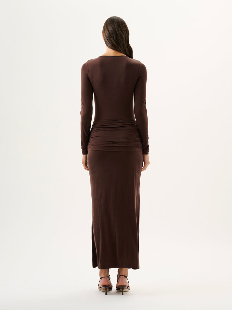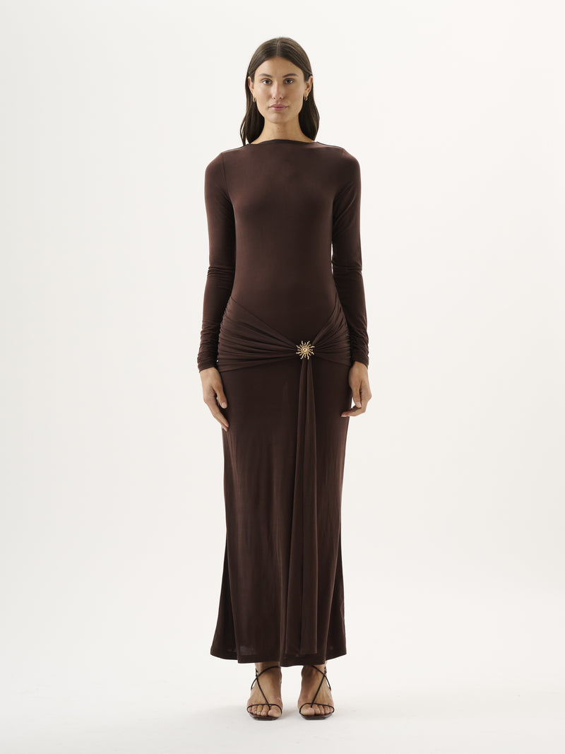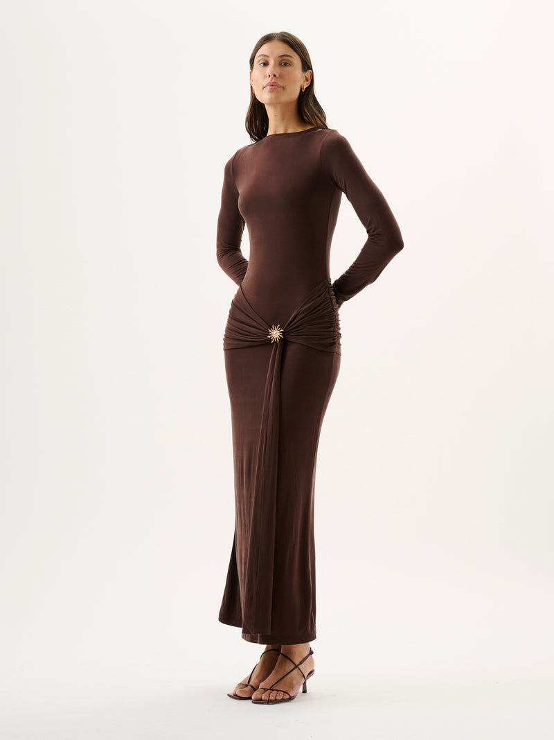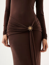 The Josie Dress in Chocolate features an elegant, cascading maxi silhouette with long sleeves and a high, round neckline in luxurious cupro fabrication. A wide ruched belt cinches the waist and the intricate hand-sketched sun motif adds a striking, artisanal touch.