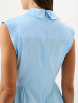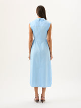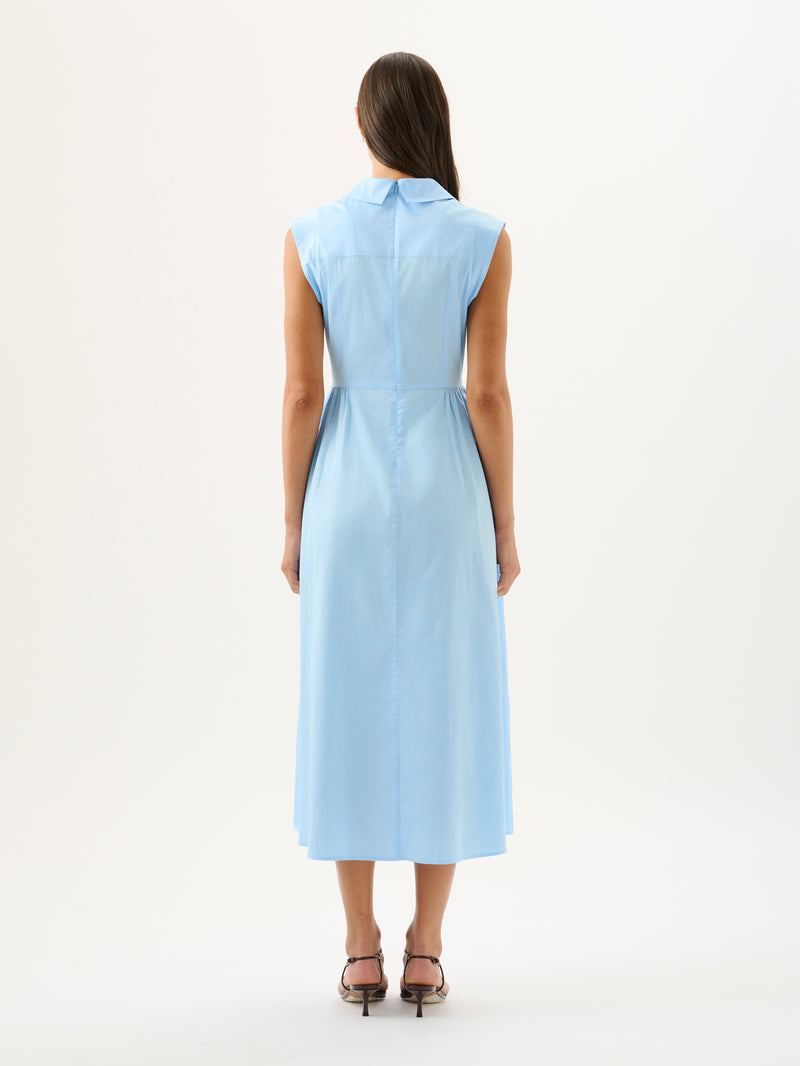 The Skylar Dress combines elegance with everyday ease. Featuring a classic collar, custom sun motif button front, and a softly cinched waist for a flattering silhouette. Finished with an invisible back zip and a flowing midi-length skirt, it’s a modern take on a timeless shape.